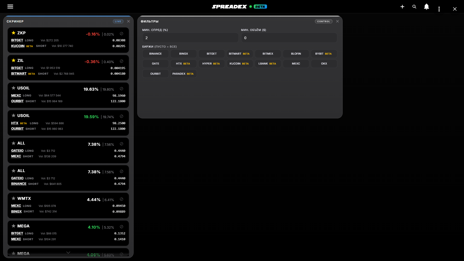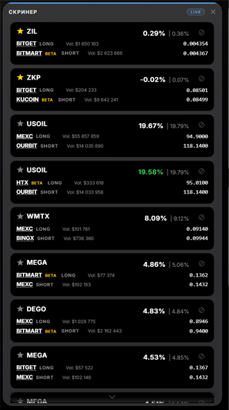 The Screener is the core of the system. It shows live arbitrage situations between exchanges as cards.
